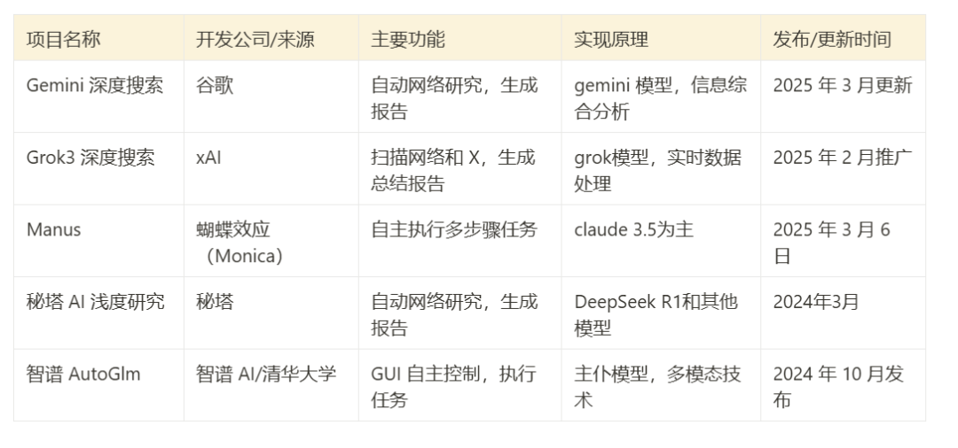 OpenAI 的尝试迅速引发了行业跟随。2023年3月以来,多家公司纷纷推出了自家的自动化研究工具或 AI 代理(Agent),它们通常被称为 "AI 搜索助理" 或 "深度研究" 工具。这些工具的核心理念相似:利用强大的 AI 模型能力,结合网络搜索,自主执行研究任务并交付成果。